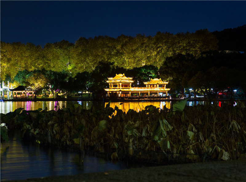 • 杭州夜色下西湖邊上建筑群燈光秀,夢回唐朝